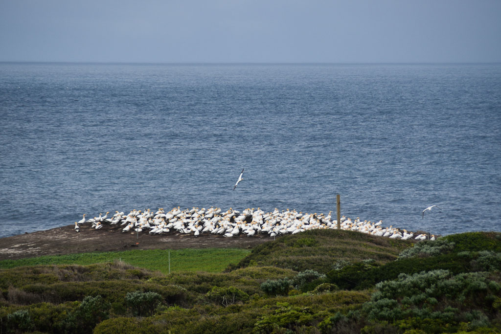 At Portland in Victoria, we drive out to the aluminium smelter which is surrounded and powered by, wind turbines. It’s windy all right. There is a gannet rookery on Point Danger and it is a pleasant walk between the rain showers. The only sound is the surf and the whine of the wind turbines. Yes, they do whine. The birds are all clustered on the point and take turns to soar gracefully overhead. This rookery started with only a few pairs in 1996. There are now more than 6000 pairs here and on the small island offshore. Surprisingly right behind the viewing platform is the rifle range, with signs saying “Danger shooting range”. Some misguided souls have even taken pot shots at the pictures of gannets on the information sign. I’m glad that we’re here on a weekday.