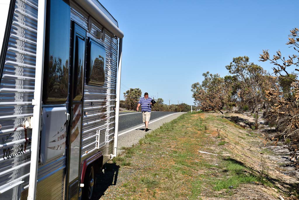 On a narrow stretch of road approaching Burra in SA – I jumped into our friend V’s car for the last leg of the day. Just as we were discussing the merits of Milenco mirrors Woody came on the radio and asked us to pick his right hand mirror up, off the road. I guess you could best describe it as fractured. Thankfully our mate D was carrying a spare set on board.