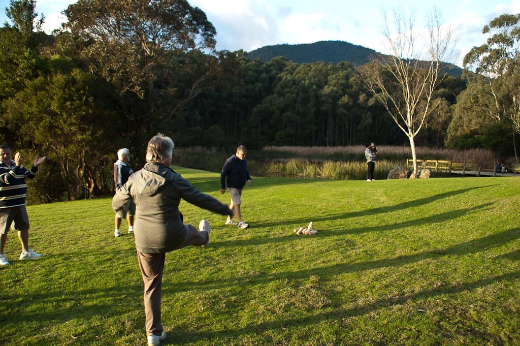 We had spent the weekend with mates in Badgers Creek Caravan Park in Healesville prior to us leaving on the first leg of our ‘big lap’. It was a very ‘nose cold’ night but we slept in until 7:15am. It is around zero degrees. Brian leaps under the shower and there is only a trickle of water. After racing about to check the taps he decides on a quick ‘bush shower’ under the trickling shower. Then it is my turn and guess what? There is barely a drop left. We hadn’t filled the tanks at home expecting to keep our weight down until Healesville and now there is nothing left and there is a burst water main out on the Don Road. Much to the annoyance of the ducks, the park managers are kept busy flushing the toilets with buckets of water from the swimming pool.