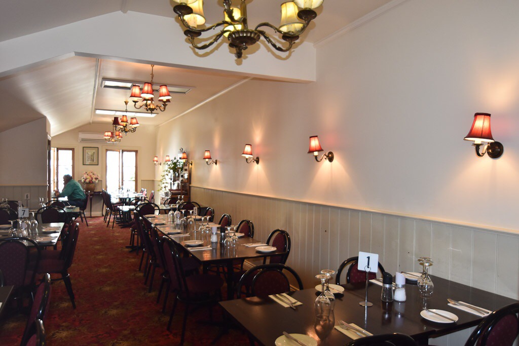 If you meander about 10 kms south of Jamieson, Vic along the Woods Point Road, the road follows the river and is rather winding so meandering is the correct description here, you will find the quaint old Kevington Pub. Built in 1862 it is the last of the original pubs on this road. The others having succumbed to the ravages of fire or progress. The hotel is flanked by tall poplars that are as old as the pub. It is well placed in gardens that roll down to the banks of the wild Goulburn River. The narrow bar is adorned with deer heads and the friendly publicans are much more animated. This is a true family run hotel. Only three families have owned this hotel throughout its long life. There are historic cabins out the back where one can stay over or better still camping is allowed on the lawns out back for a small price.Food wise, the parma’s and burgers are huge and delicious. There is a pretty paved beer garden that soaks up the sun on a nice day. Indoors is the biggest surprise, a charming dining room with original decor.