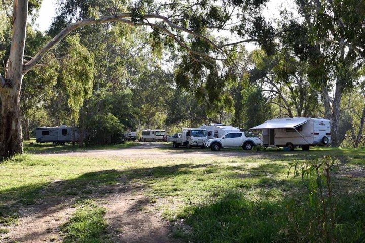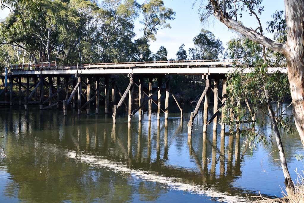 The residents of Seymour, Vic have done a great job in providing a free camp at historic B Crossing. Just out of town on Northwood Road and beside the Goulburn River this is the perfect spot for a first night out of Melbourne. There are plenty of grassy sites and most are level with views of the river. There is plenty of shade and of course sunny spots for the TV buffs who need satellite reception. There is a charming old wooden bridge that requires quiet contemplation. Now if only we could fish, that would make it perfect.