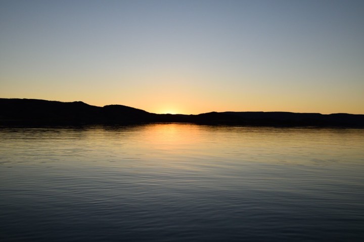 We cruise around the islands of the lake and see wallabies, fresh water crocodiles, even a baby one and golden orb spiders. The lake is about forty times the size of Sydney Harbour and if it ever reaches its capacity it will be about eighty times that of Sydney Harbour. Don’t tell the folks in Sydney. The boat has two 250hp Honda outboards on the back, the water is as smooth as glass and we glide about fast and slow across the glassy surface. It is so relaxing slipping and sliding in a sea of reflections. At sunset the boat stops and we all jump over the back and swim in the warm, seemingly bottomless water. It makes you want to stretch your legs to their utmost to feel the depth. Our skipper pours glasses of bubbly and floats out a tray of nibbles to us. Have you ever tried to drink and swim at the same time? It’s not easy, but watching the sunset from the water has a relaxing effect on everyone and the boat is awash with laughter and wet towels and the Kimberley evening is balmy.