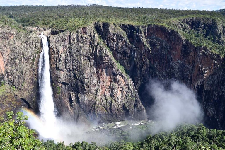 Wallaman Falls is 50kms behind Ingham and the last 20kms is almost vertical, or is that just the ice box full of produce from Ingham weighing us down. The falls are at the top of the Great Dividing Range. We drive through cane fields and the criss cross of cane train lines. Beyond the cane fields there is bushland complete with grazing cows. The cows wander the roadsides and even sit on the bitumen, lazing cows.As we enter the National Park the road climbs steeply. Halfway up there are stunning views to the farmland and as far as the islands. This is where the rainforest begins. Almost prehistoric, beech forest, umbrella trees, palms. Monsteras climb the trees and vines hang down to the roadway. Fallen trees are suspended high above the road by the thick vegetation. The falls can be heard before they are seen. 268 metres in a single drop, the highest in Australia, they plummet into the gorge with a shuddering roar. Spray billows through the gorge creating its own rainbow. Large butterflies flit through the air.