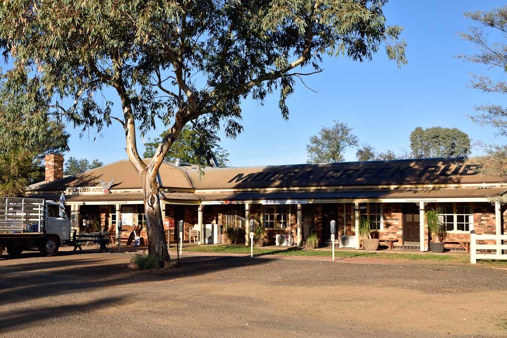Home for the night is the Mulga Creek Hotel at Byrock ” out past the kiddies playground darl.” The ground is red dirt and the trees well, they’re Mulga. As we follow a track out to the “Rock Holes” a flock of big furry goats race past us. The Rock is flakey with shallow water filled holes, and channels that we wonder may have been man made in antiquity. There are tiny yellow water lilies floating on the water and a frog croaks.