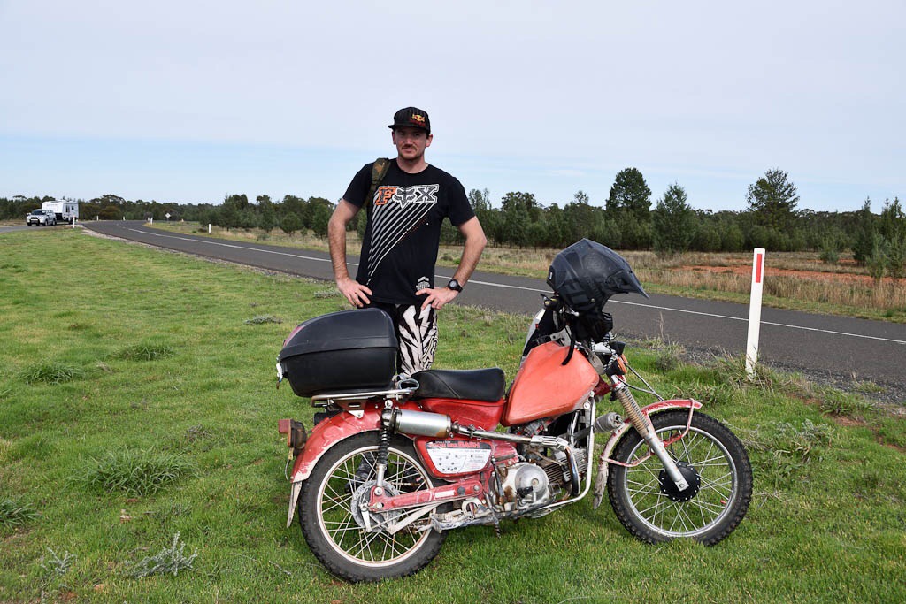 We stop to stretch our legs at Gilgunnia Rest Area on the Kidman Way in New South Wales and read the history boards. This was once a gold mining town of 1000 people and now it is little more than a piece of gold mining equipment and a dunny in a concrete tank. A ute with a fuel tank on the back pulls up and we wonder what he is doing. Out of the blue a little red postie bike arrives putt putting and fills up followed by another and another. It turns out that they are 30 in total and they’re on a 3000 km ride around New South Wales to raise money for cystic fibrosis.