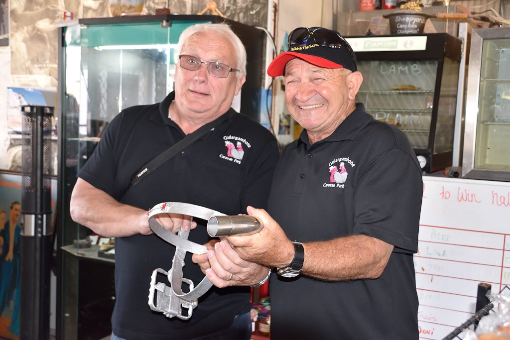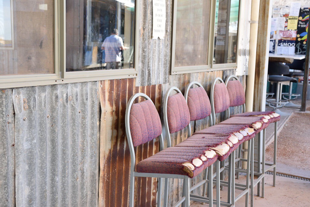 On again past corrugated iron masquerading as houses, hulks that were once cars and hundreds more mine shafts with little plastic pipes sticking out of the ground for air circulation. The Sheepyard Inn jumps out at us beside the sign that says ‘cars with brakes give way’. A friendly lot this mob are. It is part pub, general store and war memorial and this barmaid shows the boys how to don a male chastity belt. What a nice lass. A bunch of miners sit watching TV and cracking one liners. Now this is a pub.