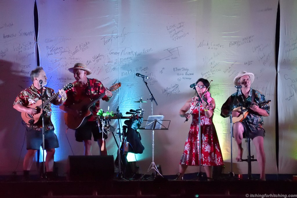 Tonight it is ‘walk up’ night in the town hall. It’s hot and we dare not move for fear of overheating any more than we already are. The fold up chairs are hard but the talent is entertaining and as usual the standard of dress is shorts, T shirts and thongs. We meet a retired dairy farming couple from ‘3 miles down the road’ and he tells us that his Mother always insisted that he love his neighbour, so he married her. At the end of each bracket there is a dash outside to the Eskies for more cold beer.