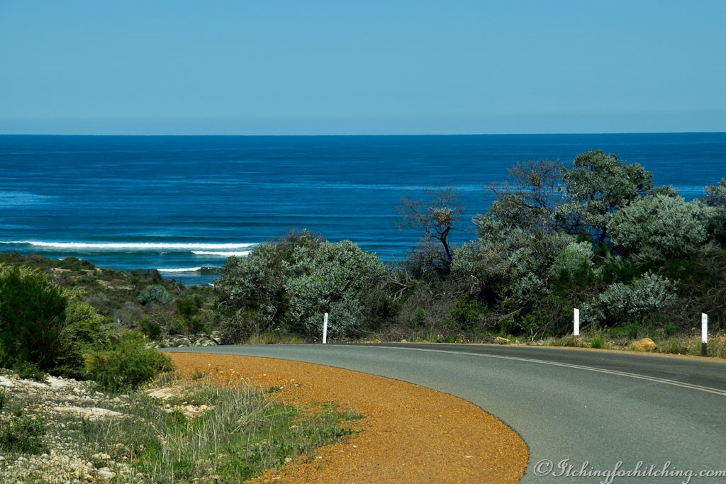 We drive 25 kms north of Geraldton to Coronation Beach camp ground. It is quite a sight, the blue of the ocean, lines of breakers and the surf crashing in. People stroll about lazily their heads encased in fly nets. Geraldton can be seen away to the south. There are a limited number of sites here tucked in amongst the shrubbery so one must be early to secure a spot.