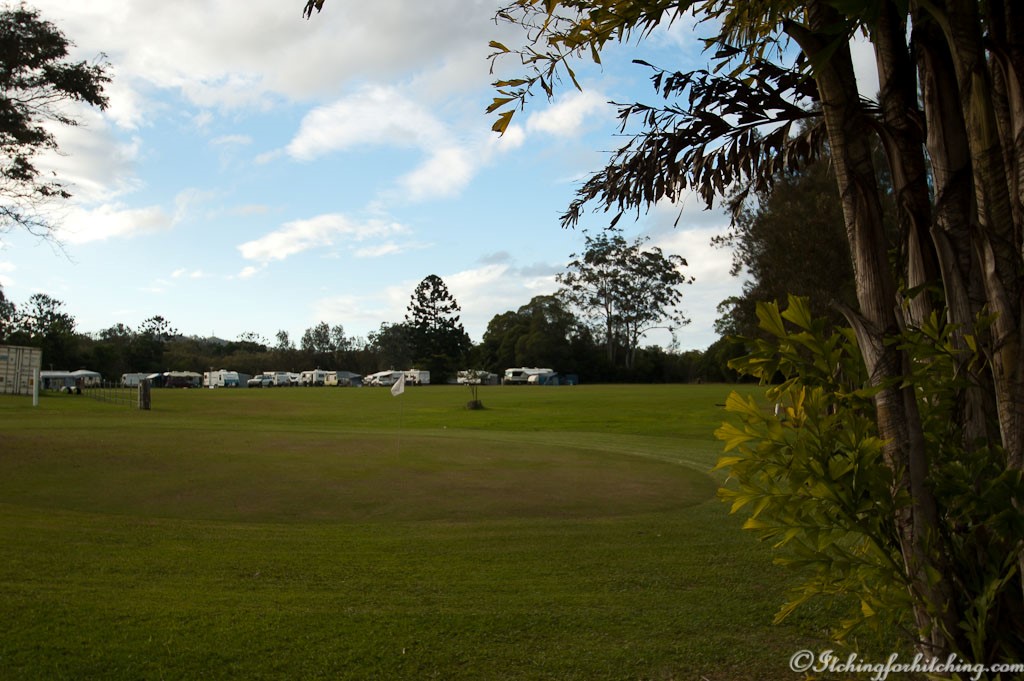 At Mullumbimby Leagues Club we ask a couple of regulars for the camp ground caretaker. “See that bloody big Norfolk pine over there, ask for Marg”. Bordered by the footy ground, a golf course and the river, the camp ground is a large grassy area with about twenty vans, motor homes and buses it costs us $25.
