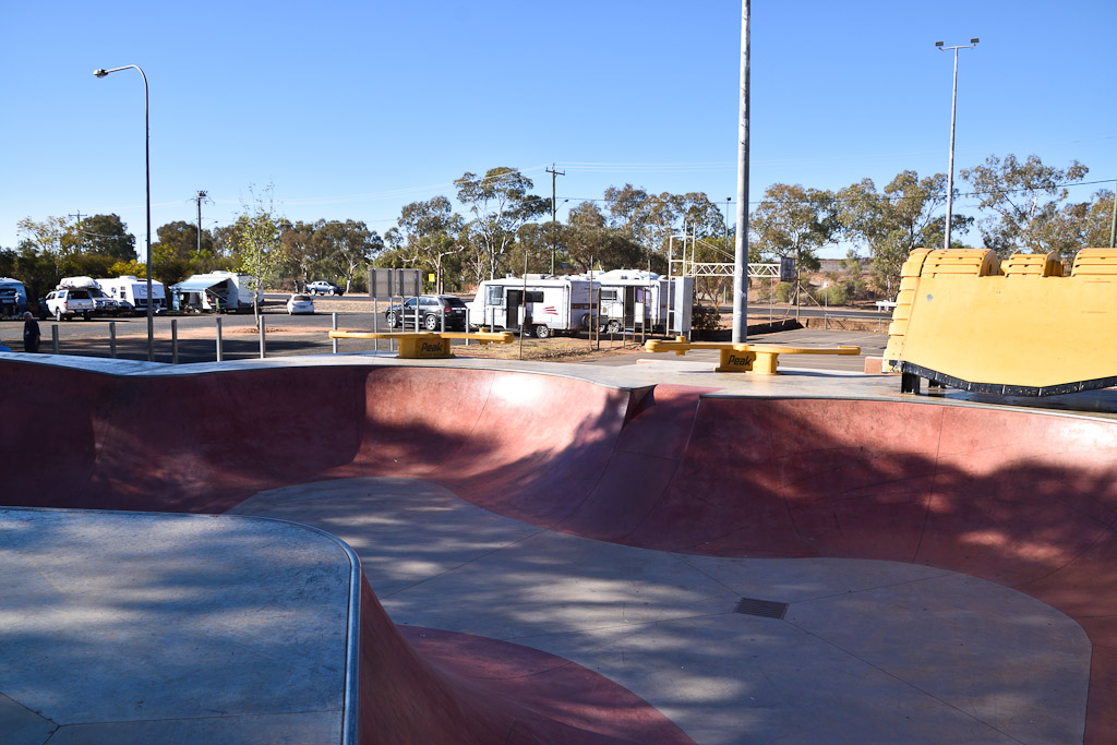 In Cobar, NSW our favourite freedom camp the Newey Reservoir has been closed, but a kind local directs us to the skate Park which has now become the unofficial freedom camp. The story goes that thanks to a resident complaining to the Lands Dept in Sydney about campers’ dogs upsetting her precious pooch, beautiful Newey Reservoir has been closed to campers. Local residents want to keep a freedom camp open to bring cash flow to the town, after all if people stay the night they will spend money. It is surprising how fuel and grocery purchases add up. We’ve stayed in some funny places but this is a first for us, a Skate Park, now how about that.