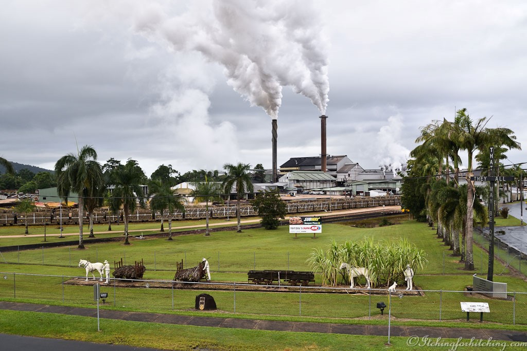 Tully on the Far North Queensland east coast is the wettest town in Australia because here the Great Diving Range almost touches the sea and it starts to rain as we approach. This is the first rain of the trip so far (a month). Tully has a busy shopping strip sandwiched between the sugar mill and the mountains. In the park there’s a 7.9 metre high concrete gumboot signifying the amount of rainfall of 1950. Inside, the gumboot is lined with photos of memorable floods. Rain or not you can’t help but love this little town and they love their rain.