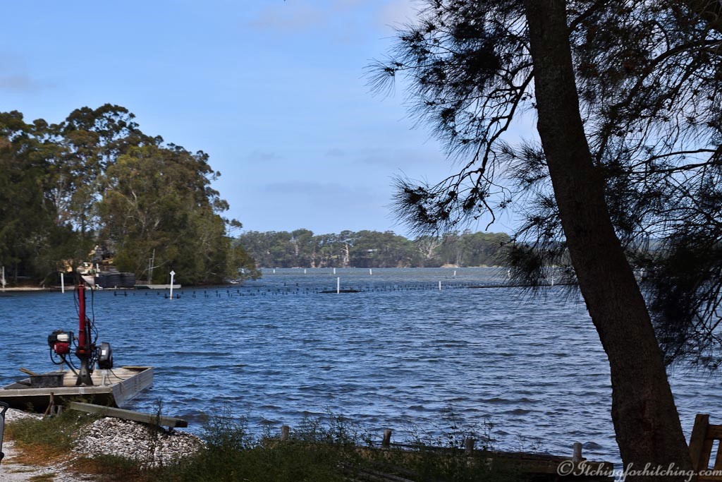 Staff at a cafe direct us to the oyster sheds south of Moruya to a dot on the map called Turlinjah, on the Tuross Lakes. We notice a bloke on a bicycle, there’s no one else around, and follow him down a nondescript bush track and bingo we find a rather unwashed fellow surrounded by oyster paraphernalia who is happy to sell us a few dozen.