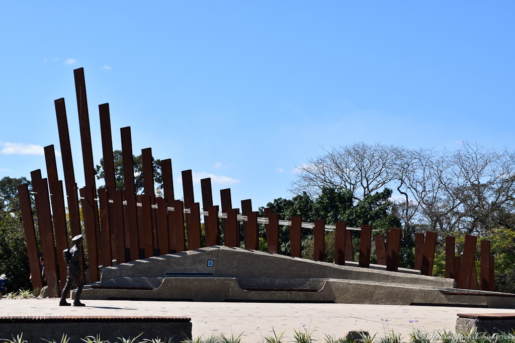 We’re having a rather social time in Maryborough catching up with ‘on the road’ friends, with family and others who’ve decided to put down roots at nearby Hervey Bay. Short on time Woody races into the supermarket to buy Happy Hour food (cheese, bikkies, salami and the like) and I take a brief opportunity to do a speed tour of the new Anzac memorial which is handily located opposite the Woolworths supermarket.