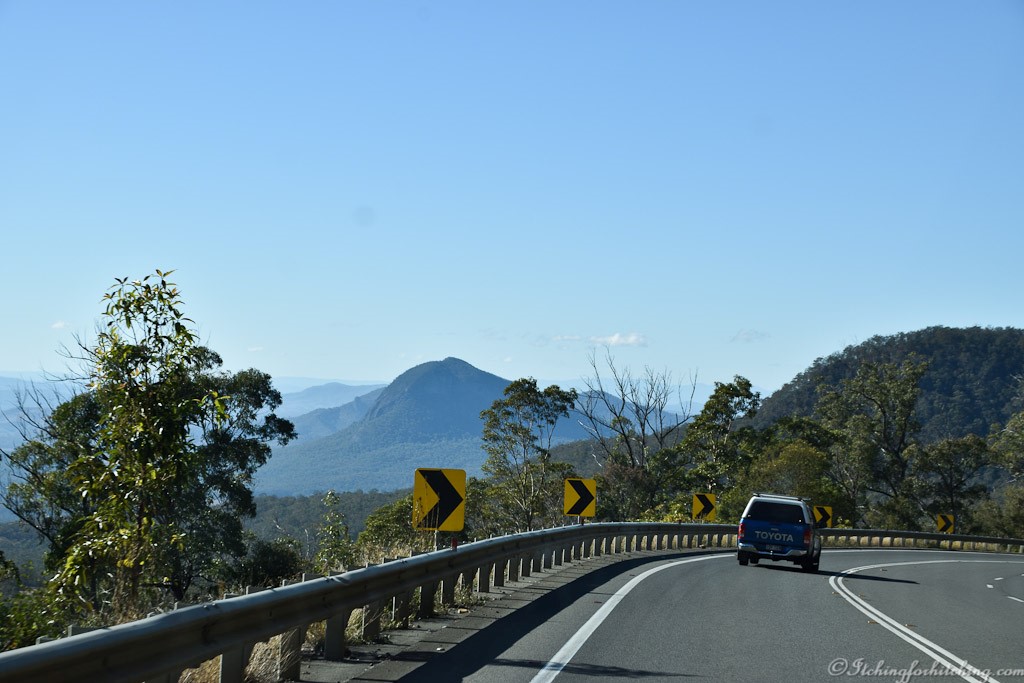 It’s a clear morning and the farms around us are a picture. By 9:00 it’s already climbed to 14 degrees and we’ve noticed another interesting freedom camp, the RV stop at the little town of Allora on the New England Highway, though it certainly wouldn’t be as quiet as Bony Mountain. A few kilometres later we pull onto the Cunningham Highway. Warwick is to our right and the peaks of the Great Dividing Range to our left. This is an interesting stretch as we commence to climb, small farms on black volcanic soil are a delight to behold, you know, the places where you briefly think gee I’d love to live here. Then you remember how cold it gets at night.