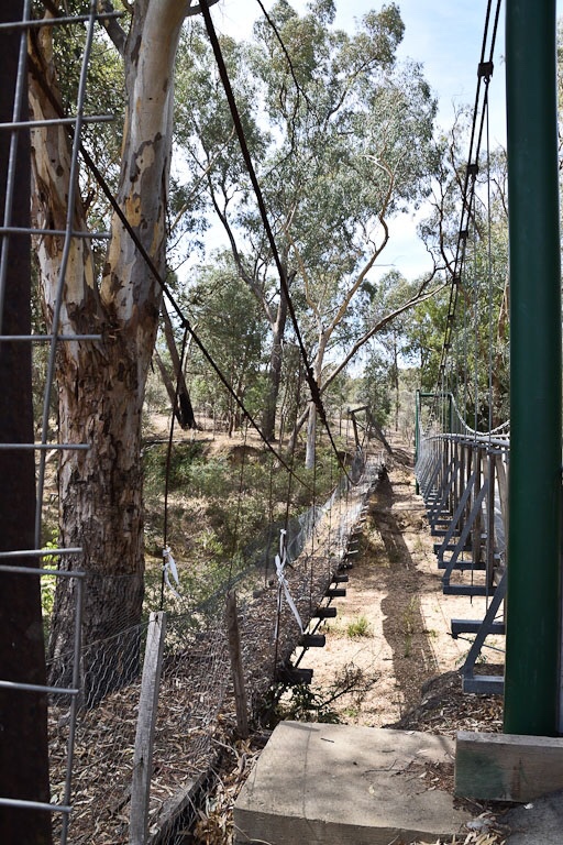 Eldorado was a gold mining town and we don’t really know what to expect other than a hot, dry landscape and we’ve heard there are some mining relics. We find a quaint old stone church, St. Judes, and a quirky town. It is indeed hot and dry. There’s a broken old swing bridge over a dry creek. A new swing bridge now spans the gully.