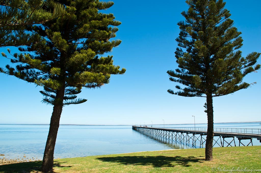 Ceduna is as pretty as a picture. The calm blue bay is lined with Norfolk Pines and lush green grass. After stocking up on supplies we have fish and chips at the Ceduna Hotel overlooking the bay.