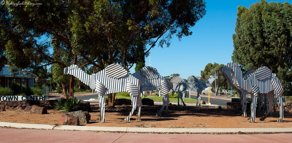 The road to Norseman is beautiful as it is lined with bushland of Salmon Gums that have bronze trunks that glow in the morning light. Norseman is clean and spacious with the kind of easy turning wide streets that caravanners love. The town was named after a horse called Norseman who was clever enough to paw up a nugget of gold and thus cause a gold rush. On the main street there is a whimsical corrugated iron artwork honouring the work of the camels of the past.