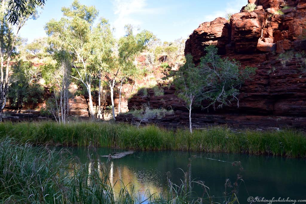 The Joffre Falls are delicate and the gorge is beautiful. We stand and applaud the climbers making their way up. Each gorge seems to be better than the last and at Kalamina Gorge we are able to easily climb down to the valley floor and enter that other world of tall white paperbarks, tessellated ‘pavements’, green rushes, a milky green pool and fairy like falls. The gorge walls soar high above us like building blocks.