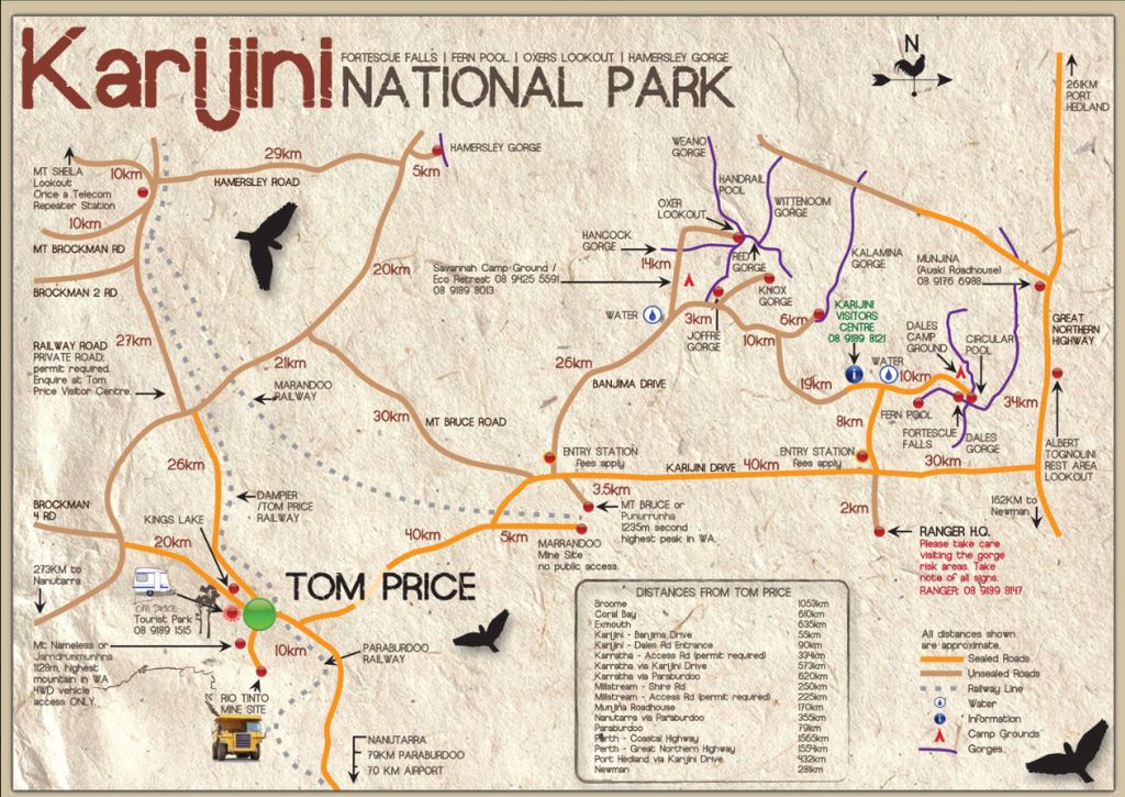 The lookouts all hang over the cliffs giving spectacular views. We look down hundreds of feet to the valley floor below and count the tiny red and black dots that are walkers in climbing gear in Hancock Gorge. Twenty metre high trees appear tiny. This place is not for the faint hearted and we are constantly reminded of those who have lost their lives in the gorges. There are very few safety rails and we make sure that we don’t go beyond class 4 (experienced) trails. Class 5 is for the mountain goats.