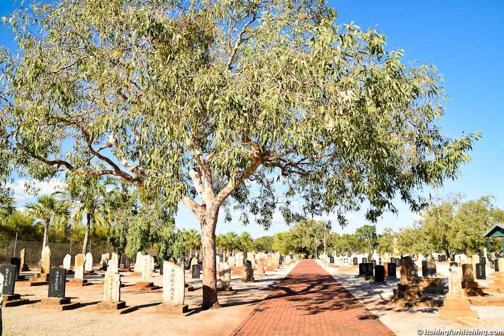 The Japanese cemetery is beautifully neat. Nine hundred and nineteen Japanese are buried here, killed by pearl diving mishaps or cyclones. Cockies squawk in the gum trees. Most of the headstones are pieces of local rock. It may not be their homeland. But it is a lovely resting place.