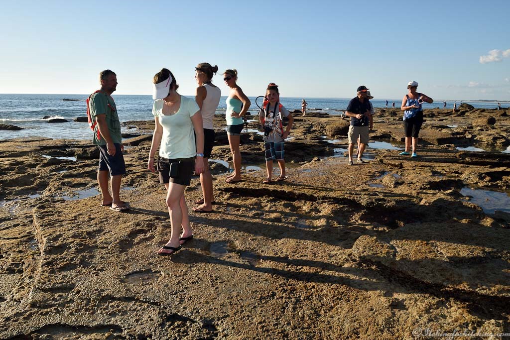 Woody has chosen to forgo cemetery visits and rock hopping at Gantheaume Point to cook dinner and I’m on a mission to see the dinosaur footprints. The tide is 30 mm below the required level for viewing them, yippee. People are wandering left, right and centre about the rocks as there are no marked pathways to get out onto the lower rock ledge. It’s a case of every man for himself and hope that you don’t break a leg. A mother is trying too hard to teach her kids about dinosaurs “now remember what I told you about the Cretaceous period? Harry are you listening?” Harry is looking for crabs. The rock pools are the best that I’ve seen and the crabs are large and there is bright red stuff clinging to the rocks and lots of coral, so I don’t blame Harry in the slightest. But where are the footprints? Well about sixty people are wandering about looking at rock pools trying to envisage foot shapes and toes. But no one can see them. We’re all looking hopefully at our maps, some folks are Googling the info, others using their phone compass. A Scandinavian woman is getting way too technical about tide height. But no one can see them. Where are they? No one knows. What do they look like? No one knows. Just then my phone rings we have visitors. I race back to camp to catch up with our caravan club mates B and P. Obviously, we were easier to find than dinosaur footprints. So good to see you guys and how great it is to catch up with friends so far from home.