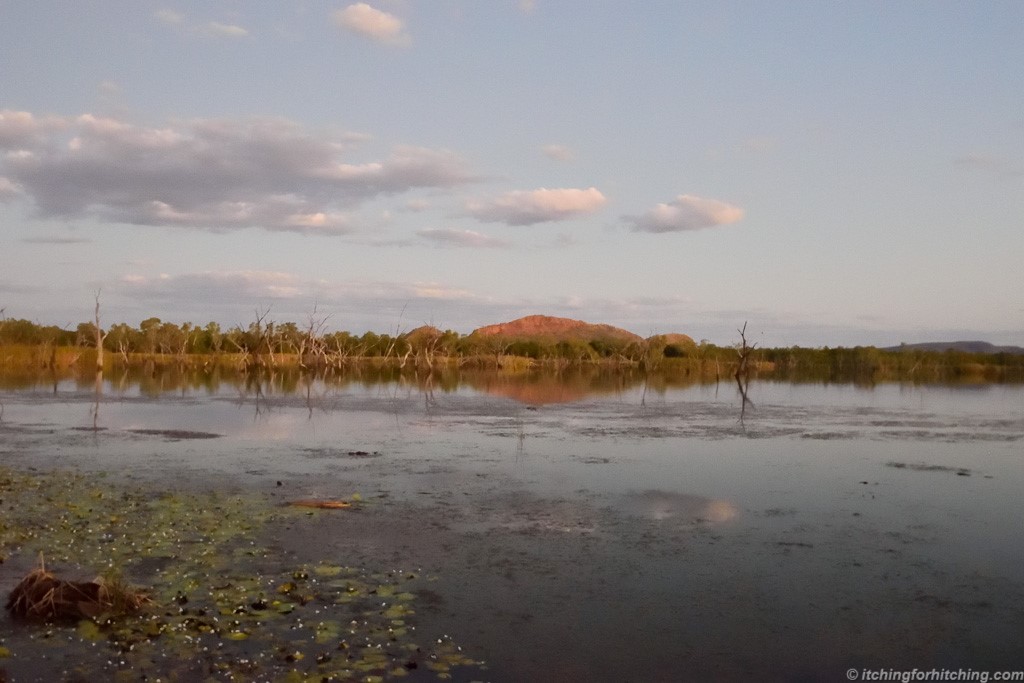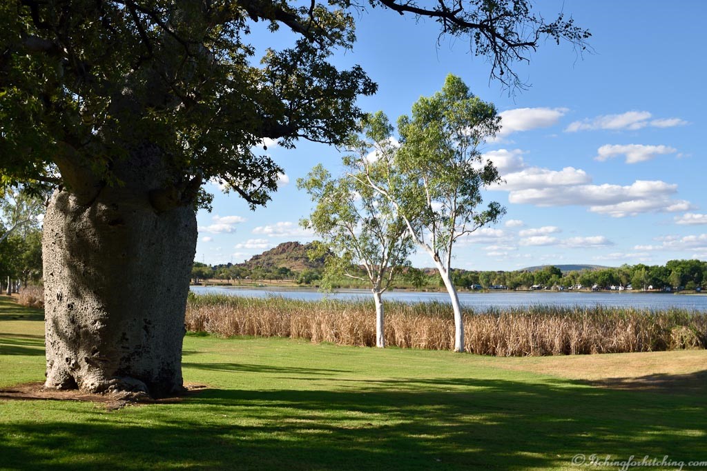 “There’s not much to see” says the young girl at the Info Centre. We take her meagre advice and visit Kelly’s Knob lookout above the town and get a lay of the land. She couldn’t tell us where historic Ivanhoe Crossing is as she hadn’t heard of it. Not surprisingly we find it on Ivanhoe Road just as the sun is setting and there are folks fishing with disregard for crocs and the water is brimming across the spillway. Of course, it is prohibited to drive on it these days and a huge boulder blocks the causeway.