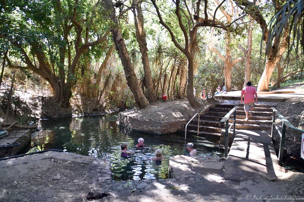Katherine, birthplace of cyclist Cadel Evans. This is a very tropical town and Shady Lane Caravan Park is all palms and mango trees. I ask the chap at the Info Centre what the main attractions are in town apart from the Katherine Gorge of course, and he replies “me”. I’ll have to stop asking that question. As crossing rivers was a difficult business in the old days there are three river crossings here, in order of age and height: Knots Crossing, Low Level Crossing and High Level Crossing. Low level crossing is all gushing and water between pandanus and melaleuca and a very cool picnic area. There are fresh water crocs here but the locals don’t seem at all perturbed as a pregnant mum is wading about giggling with the kids. But then again 25,000 crocs in Lake Argyle didn’t stop us from splashing about. Things are a little more sedate at the hot springs where the perfectly clear water spills from one pool to the next. Nomads and backpackers sit about ‘taking the waters’.