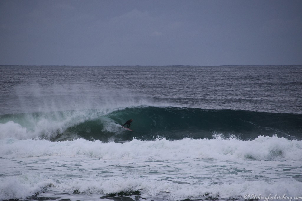 We girls put our collective feet down and insist on a late start because we can’t check in at Moonee Beach until 11:00am and for heaven’s sake it is only 62kms away. The boys are edgy but it is nice squeezing in a last walk on the V wall. The surf on the bar is pounding and two jet skis are ferrying surfers out to the waves. It’s chilling to watch as the jet skis disappear in the troughs. Two old guys (at least my age) behind me are watching them, one says “at least they’ve got leg ropes, when we lost a board it was a long swim”.