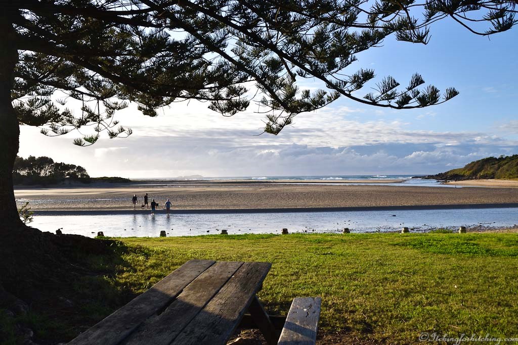 Reflections Moonee Beach caravan park is bordered by two creeks, Moonee and Sugar Mill and the ocean with Split Solitary island offshore. The unpowered area has a bush feel being bordered by forest and the park itself is well treed. Lorikeets screech overhead as they feed on the eucalyptus blossom, rabbits hop about the sites, bin chickens (ibis) patrol the grounds and brush turkeys chase each other at sundown. It’s a little like living inside a bird sanctuary. Our sites are half as large again as a normal site and as we’re all in a row we have oodles of space.