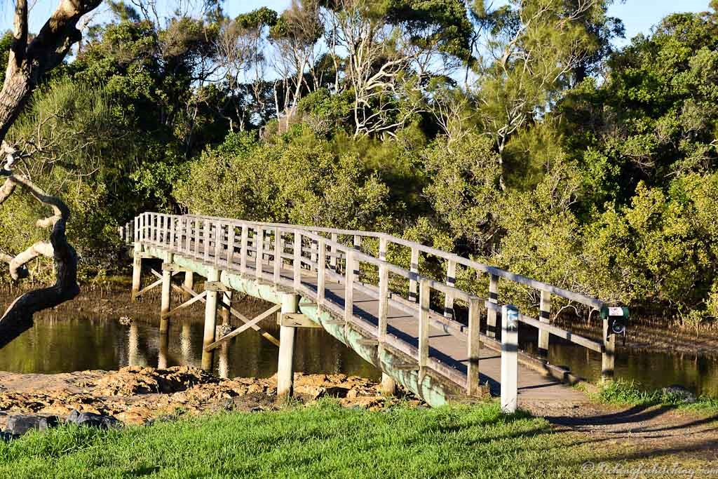 Outside the park a small bridge crosses Sugar Mill Creek and leads to the headland. Huge waves break on the surf beach beyond the sand bar of Moonee Creek.