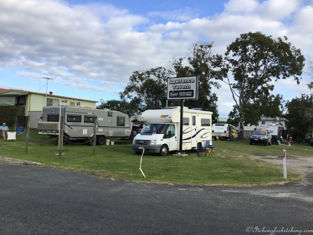 The Lawrence Tavern in the river town of Lawrence has parking in the front yard which before the new bridge was constructed was probably the back yard. To us, the camping area already looks crowded but a lady waves us in and sure enough there is plenty of room for our three vans. It is a spacious grassed area with power for only three vans (first in best dressed), two toilets and a shower. There’s even a small book exchange in the bathrooms. It is a pleasant spot with views across the cow paddocks.