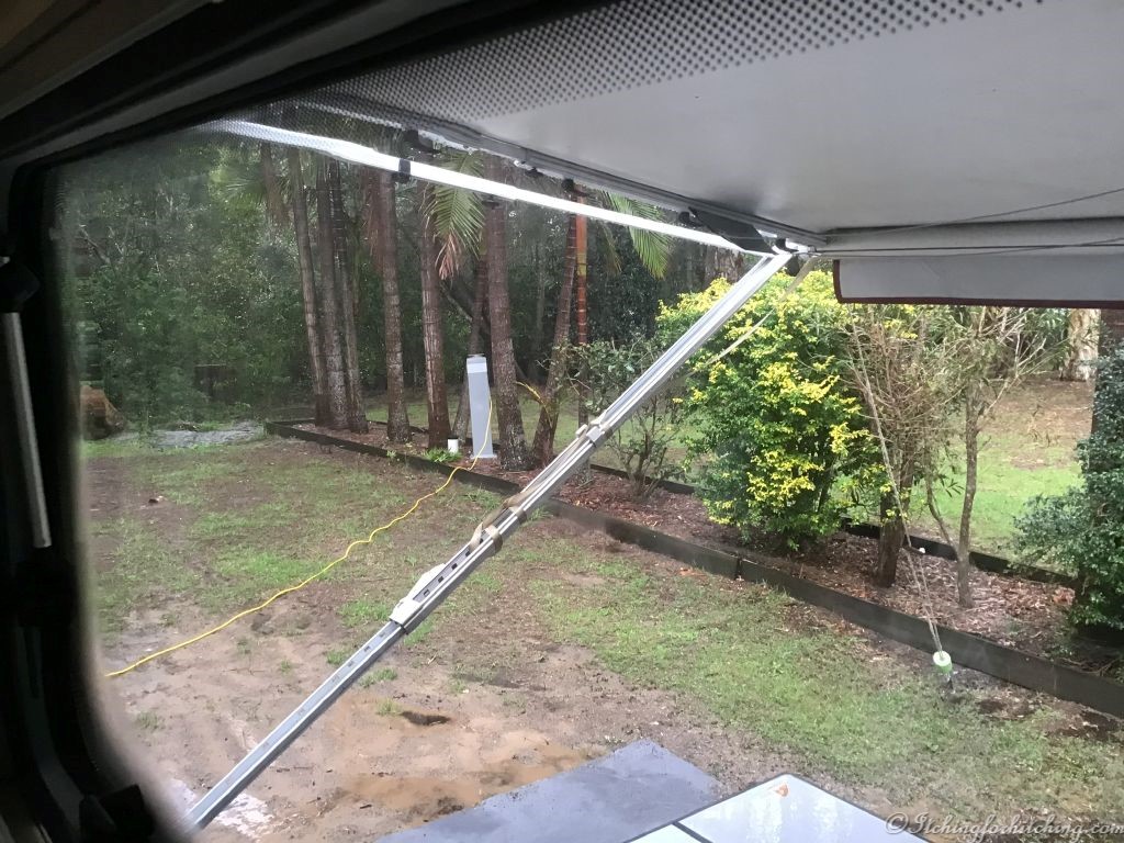 The teeming rain woke us at 2:30am. Under the bed we’ve found more water but it’s definitely a leaking hot water fitting which is quickly tightened (I only wish was that Woody hadn’t wandered off to answer the phone which he couldn’t hear anyway rather than holding the bed up for me, thankfully the gas struts held).