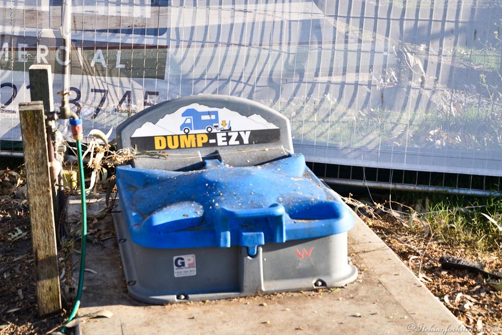 As we leave the park to go shopping in Lismore we notice VeeWee on her knees at the dump point with El Prado giggling his head off nearby (he’s a good giggler). Dressed like a vet delivering a difficult calf, VeeWee is wearing garbage bags up to her elbows and she’s groping down the chute with a pair of kitchen tongs trying to retrieve the slide from her toilet cassette. After several attempts and a lot of giggling on El Prado’s behalf she finally manages to grip the slide and yank it out of the sewer. Those tongs are quickly despatched to the bin.