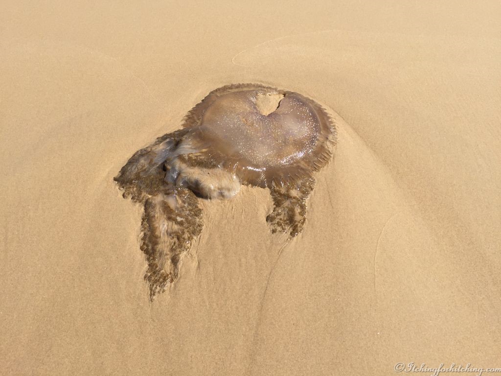 A walk up the beach on a clear blue morning. It’s warm, surfers have parked their cars on the beach. The waves are breaking in mesmerising waves and the sea has offered up a large dead jellyfish. I wouldn’t want to tangle with that one.