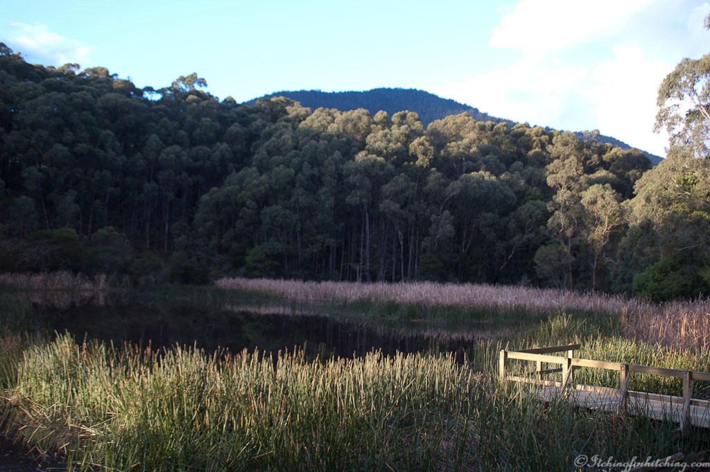 The Badger Creek park is pretty and bounded on one side by a reedy lake and on the other by the rushing Badger Creek. The lake is perfectly still and the reflections mirror the hillsides behind. There are still some red autumn leaves clinging to the trees. Tents are camped by the creek, water hens strut about and campfire smoke curls into the chilly air.