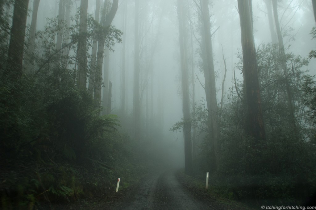 The night was clear but nowhere near as cold as we had expected. It started to rain at about 6:00am. After breakfast we pile into two cars and set out for Warburton following CJ’s GPS. We soon find ourselves crossing the shoulder of Mt Donna Buang on a dirt road in thick fog. Obviously, it is not a popular road as we see only one other car. But to our joy three lyrebirds scurry across our path and the last one steps out and gives us a display of his tail feathers. Apart from dashing lyrebirds there are tall straight gums, tree ferns dripping with moisture and the occasional roadside waterfall.
