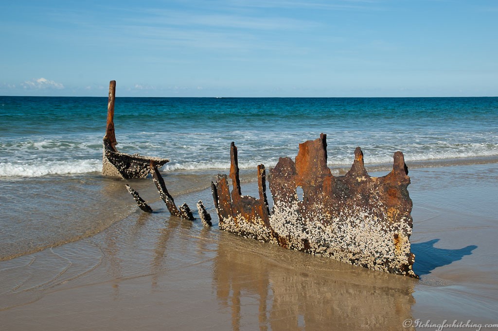 We drive south. People are sitting in the sun drinking coffee at Mooloolaba, we wander around the fishermen’s harbour and marina then drive on as far as Caloundra. We have fish and chips in the sun at a quiet little spot called Dicky Beach. It is named after a ship, the SS Dicky that foundered here. A few pieces of metal remain jutting from the sand.