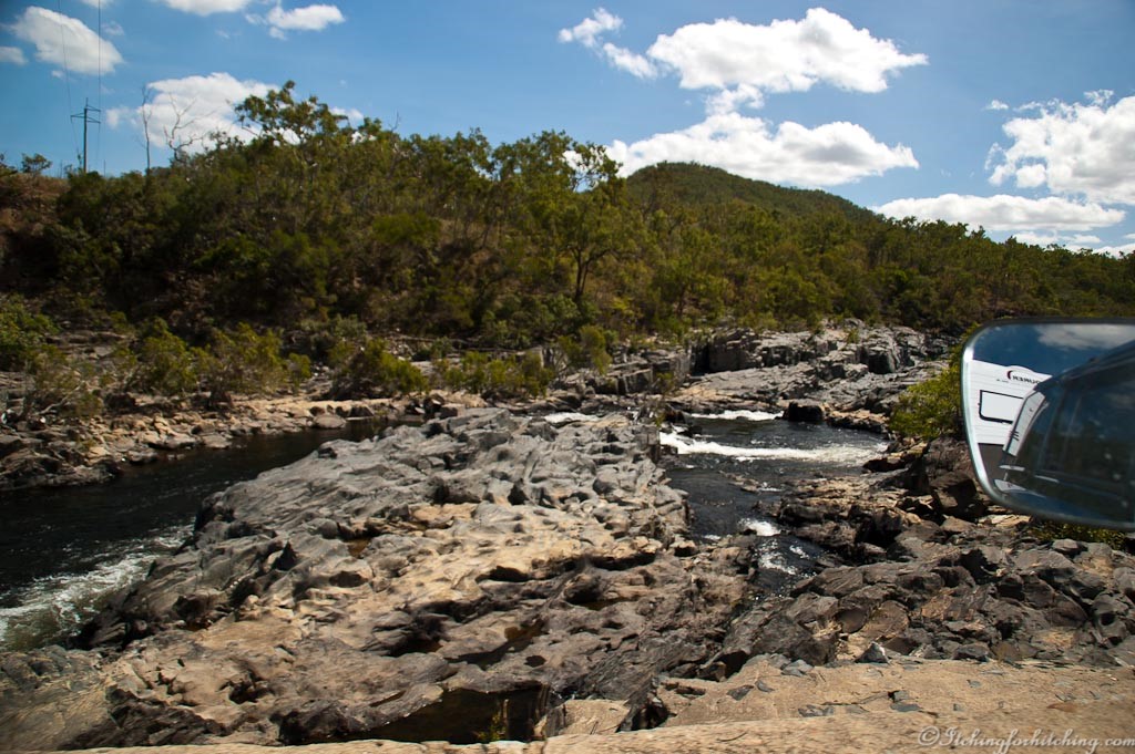 We cross the Palmer River but miss the roadhouse as it sits on a sharp uphill rise on our right. Maybe next time. At Lakeland there are several kilometres of banana plantations and other unidentifiable crops which give way to grasslands and white trunked gums. We pass through Black Mountain which is a mountain covered in black rocks and little else. There is a causeway over the rushing Little Annan Gorge.