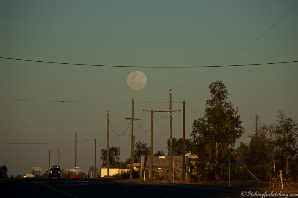 The moon rises over Winton. There is something about this place, it is hot, dry and dusty but we are captivated by it.
