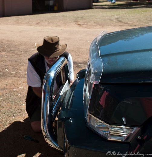 We notice that the car’s front sensor has come adrift so it gets clipped to the nudge bar to be re seated when we get home.