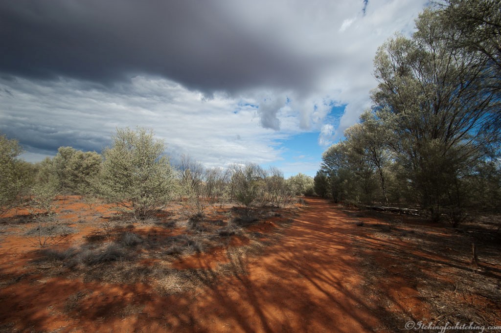 There’s a short walk through the mulga scrub. The soil is red, even redder where it clings to the roots of fallen trees. The sky is a steel grey as the rain clouds move into the distance. The mulga is grey green with spindly black trunks. A breeze whispers through the mulga.