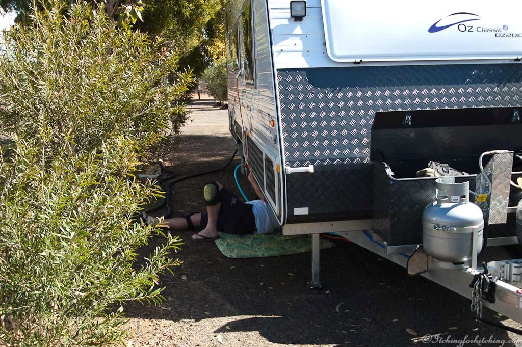 We have a lazy day crawling under the vans looking for problems. Double or Nuthin’ is having concerns about his water tank levels and we’ve snapped off both our van mud flaps.