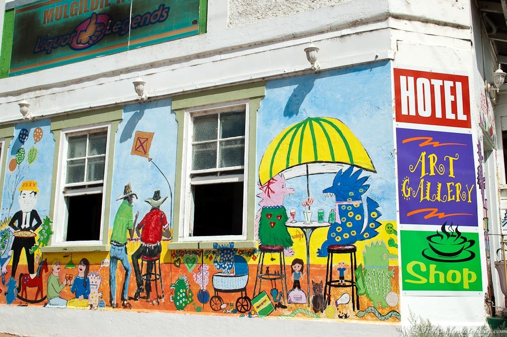 The old wooden pub is painted bright green with quirky drawings everywhere. Inside it is a feast of art and craft for sale. The ladies loo has ducks painted on the seat and the men’s loo is a little scarier with barbed wire. We sit on the tiny verandah and munch our super cheap roast rolls whilst gazing across the cow paddocks. This is a top pub. They have a free van park out the back but we fear that ‘free’ may become quite expensive for weak folks like us.