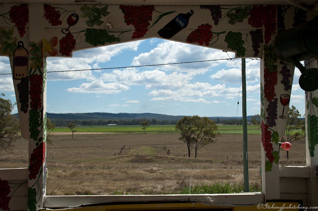 We cross the Banana Range and the soil and climate immediately improves as there are now small farms and green crops. Biloela is inviting and it is exciting to see a fruit barn once more, especially one that serves Genovese coffee. We turn south onto the Burnett highway and run parallel with the Great Dividing Range. The road is undulating and quiet. At Monto there is a water tower with a great mural of a guy sitting on the dunny reading a newspaper. These folks must have a sense of humour. Beside the road we see a sign “Monto Stockman’s store, open 7 days unless closed”.