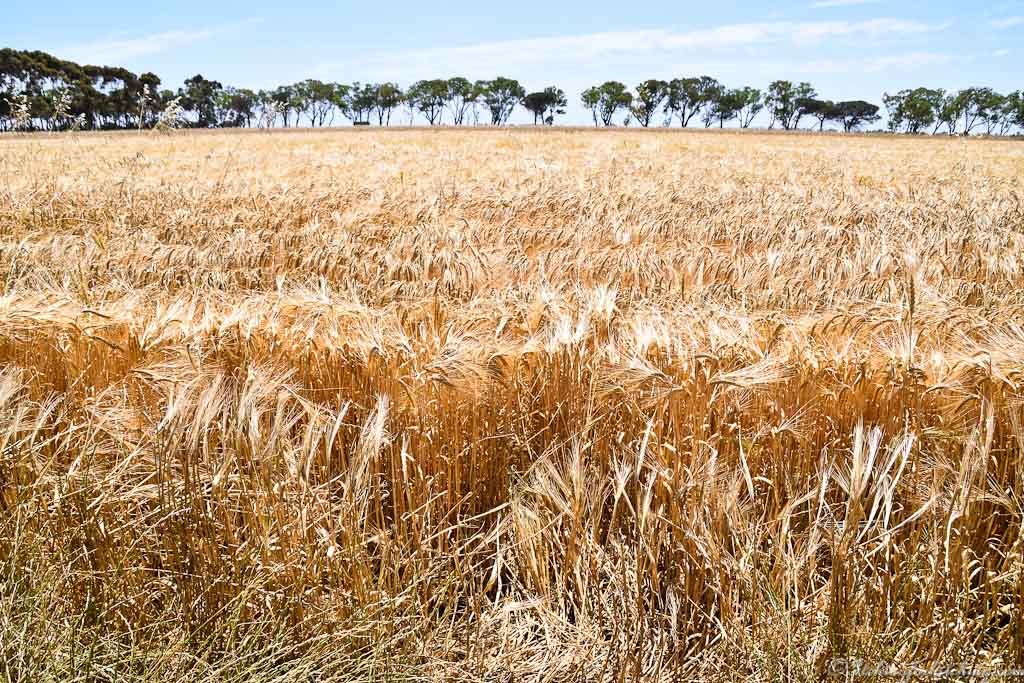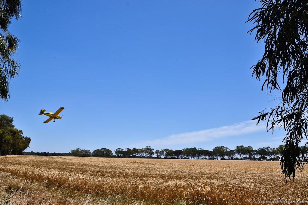 A crop duster does heart stopping swoops over our campground to drop pesticide on the wheat paddock behind us. For an hour or more we are entertained by his exhilarating low-level flying. An old farmer drops by to watch and tells us that the wheat will be harvested next week.