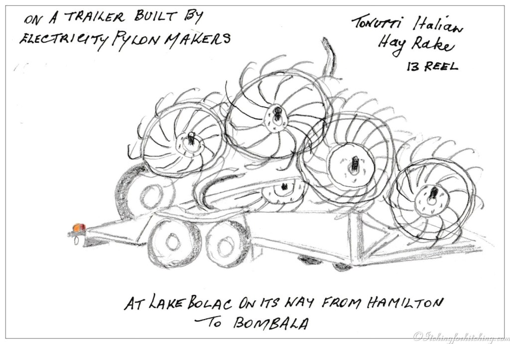 Whilst the plane buzzes a couple from Bombala in south eastern NSW drop in to eat lunch by the lake. They’ve bought a second hand Italian hay rake in Hamilton and are setting out on the return journey with nearly 750Kms to go.