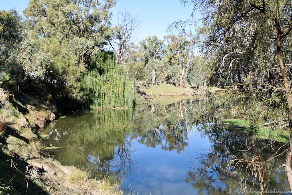 At Goolgowi we turn north onto the Kidman Way and follow it up to Hillston. The road is wider, better quality and flanked with Murray Pines. There is very little traffic. Forty kilometres north we turn off onto a dirt road. There are several vans camped at the rest area but we follow the road for another 10kms to Billabourie Farm Stay. The family is not home so we choose our spots from several acres of grassy reserve overlooking the Lachlan River. There is no one else here and it is heavenly. It is a warm afternoon, weeping willows dip in the river, water lilies are flowering. All of the usual suspects in the trees, cockatoos, galahs, small parrots, Willy wagtails, tree hoppers and apostle birds. There are no other sounds other than the birds. It is Autumn and small white mushrooms are popping up in the grass and the air smells of paddocks. We cook steaks on the BBQ with what we call caravan chips and eat outside. By the time that we turn in Scorpio is gracing the eastern sky. This is Aussie bush splendour in all its glory and those vans at the highway rest area have missed out on it all.