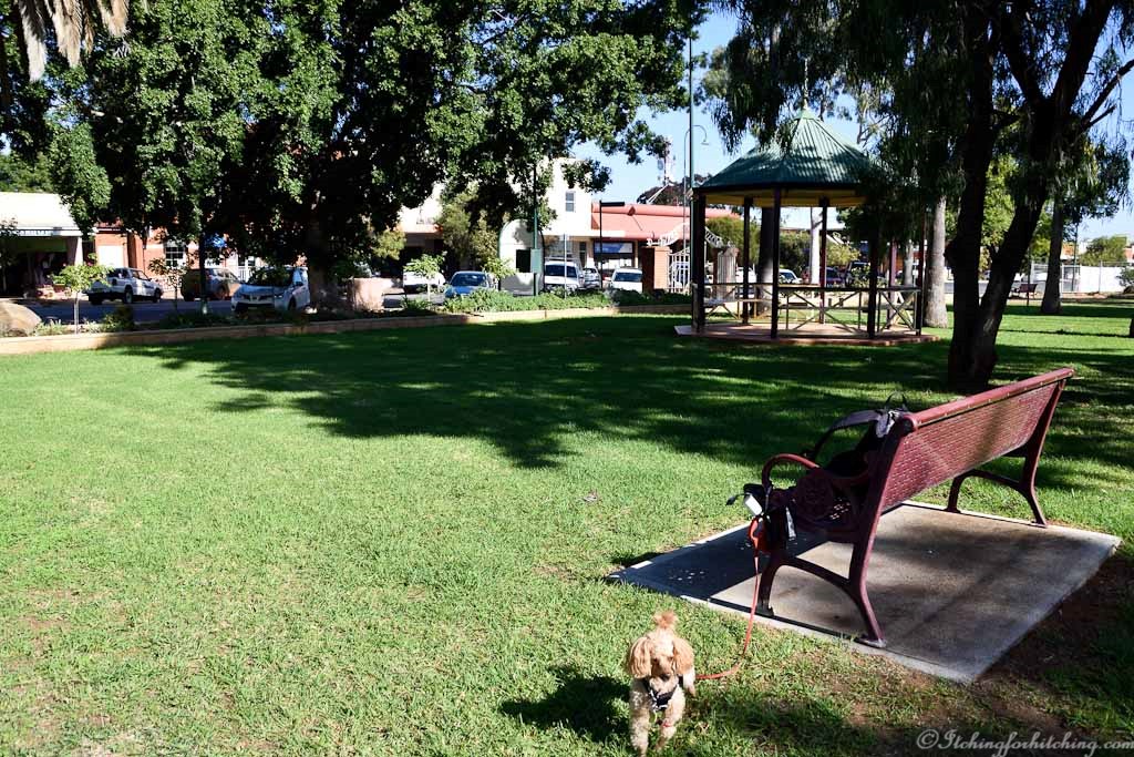 We take the Barrier Highway east to Nyngan. Goats graze and the Murray pines eventually give way to gums and grain paddocks. We stop for morning tea at Nyngan and are surprised to find a delightful little town. On the banks of the Bogan River the streets are well treed and frangipani and hibiscus bloom. We must really be getting north now (in line with Port Macquarie in fact). There is an Iriquois helicopter on display in recognition of the choppers that evacuated the town in the 1990 floods. We have coffee and note that the undertaker has a double shopfront with a window display filled with artificial flowers.