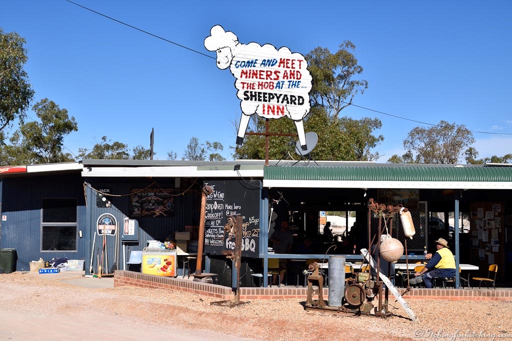 On again past corrugated iron masquerading as houses, hulks that were once cars and hundreds more mine shafts with little plastic pipes sticking up for air circulation. The Sheepyard Inn jumps out at us just by the sign that says ‘cars with brakes give way’. A friendly lot this mob are. The Sheepyard Inn is part pub, general store and war memorial and this barmaid shows the boys how to don on a male chastity belt. What a nice lass she is. A bunch of miners sit watching TV and cracking one liners. Now this is a pub.