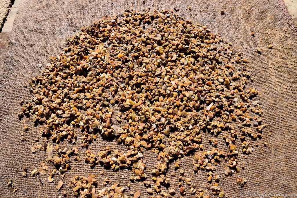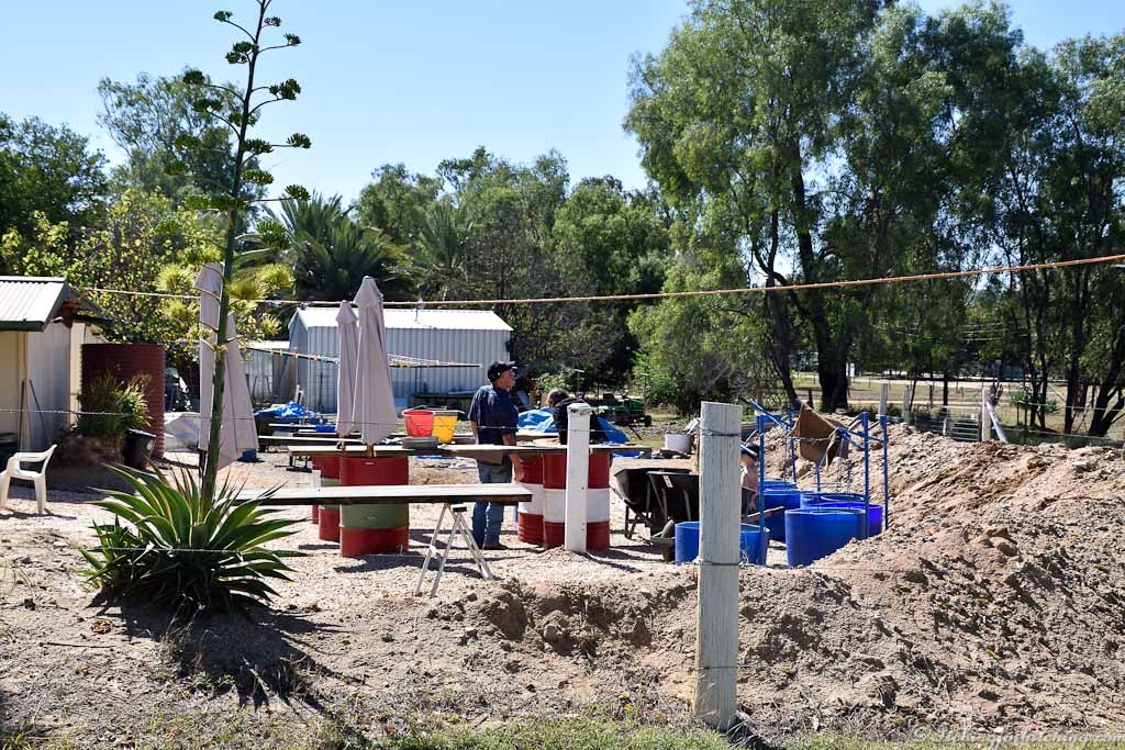 Out of curiosity we follow a sign to Willy’s Wash and spend $15 for a bucket of ‘wash’ or should I say gravel. A bubbly lady called Karen shows us how to wash the wash in a Willoughby. Which is a dunker that sluices your colander of wash. We upend the colander of wet Willoughby’d wash onto a hessian bag and set to with a pair of tweezers to sort through the pile of now clean gravel to find the sapphires. I am eternally grateful to Karen for showing us what to look for because of all the stones the pretty ones turn out to be rubbish and the stuff that looks like bits of black road gravel are the sapphires. An hour or more passes as we wash wash and pick at tiny bits of gravel. I am so engrossed with this fossicking caper that I fail to notice that the mine is actually beside us until Karen’s partner who is working the mine pops up with more dirt, sorry wash.